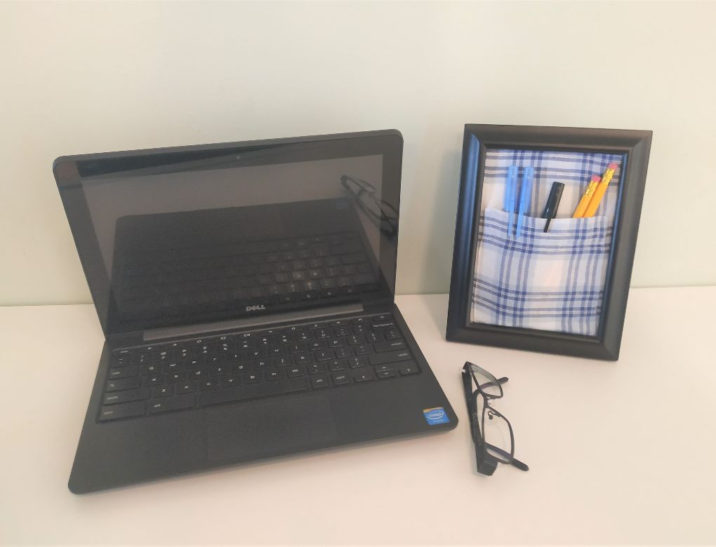 DIY Father's day gift plaid shirt pocket organizer filled with pens and pencils next to a pair of glasses and a computer.